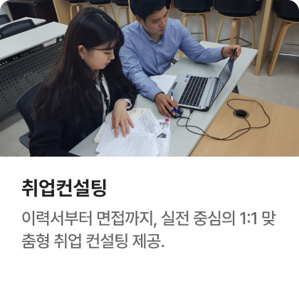 과정중에는 취업지원상담, 취업특강이 진행되며, 과정 수료 후에는 6개월간 사후취업관리를 받으실 수 있습니다.