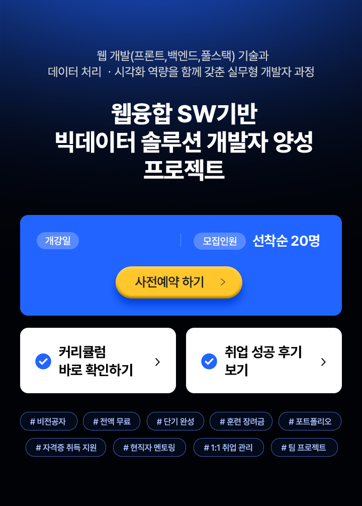 빅데이터 플랫폼 구축을 위한 프로그래밍 언어 활용, DB시스템 구축, 웹 융합 SW 개발 기술 등을 습득하여 빅데이터 솔루션 및 데이터 분석 기법을 활용한 SW전문가로 취업하는 과정